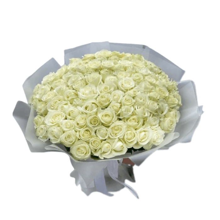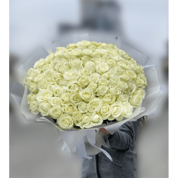 Склад: 101 біла троянда, пакувальний папір, стрічка.