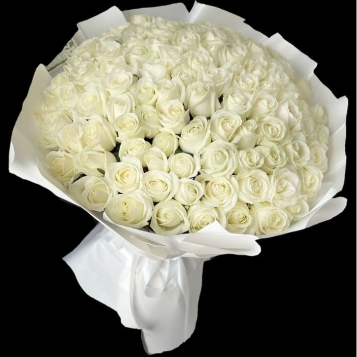 Склад: 101 біла троянда, пакувальний папір, стрічка.