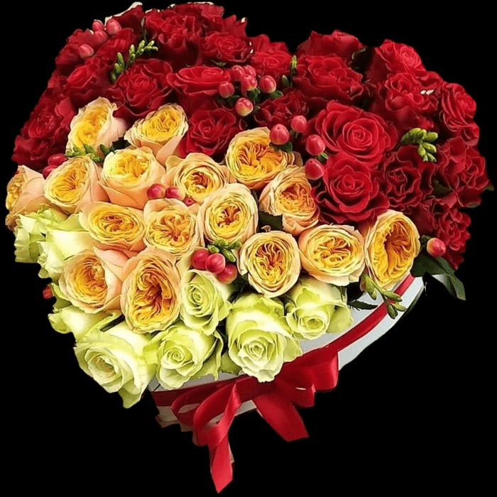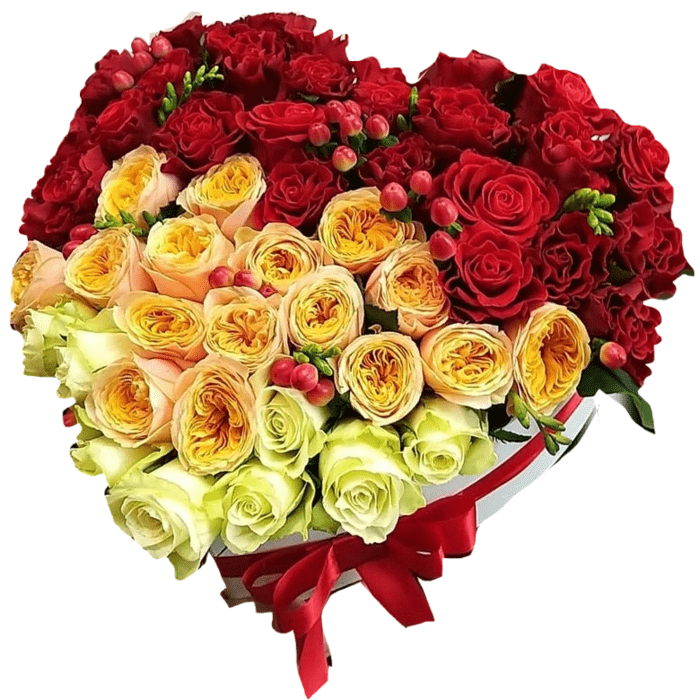 Склад: піоновидні троянди різного кольору, гіперікум, картонний бокс у формі серця, стрічка. Склад композиції може бути незначно змінений в залежності від сезонності та наявності квітів. Але форма та кольорова гама залишиться незмінена.