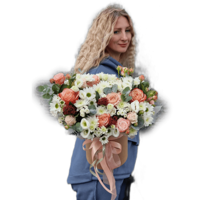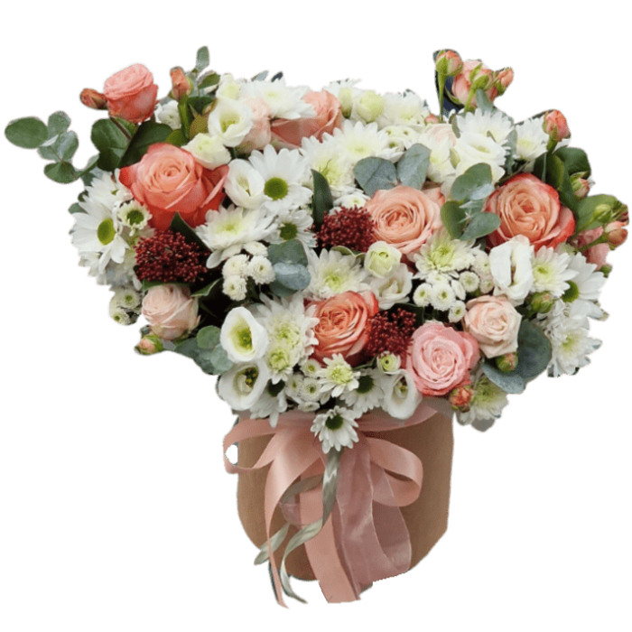 Склад: троянди, еустома, скіммієя, хризантеми, евкаліпт, картонний бокс. Склад композиції може бути незначно змінений в залежності від сезонності та наявності квітів. Але форма та кольорова гама залишиться незмінена.