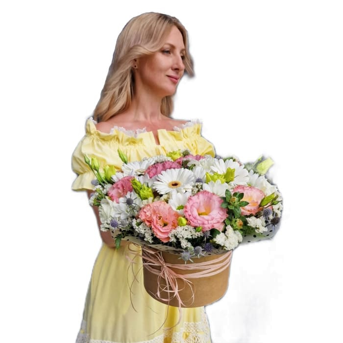 Склад: гербери, еустома, статиця, картонний бокс, стрічка. Склад композиції може бути незначно змінений в залежності від сезонності та наявності квітів. Але форма та кольорова гама залишиться незмінена.Перед відправ...