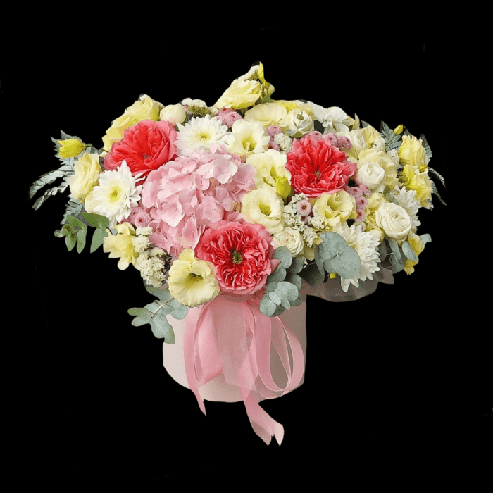Склад: гортензія, піоновидні троянди, еустома, хризантеми, евкаліпт, картонний бокс. Склад композиції може бути незначно змінений в залежності від сезонності та наявності квітів. Але форма та кольорова гама залишиться незмінена.