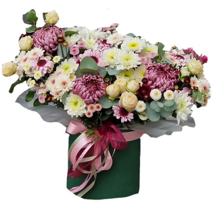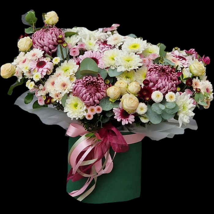 Склад: хризантеми різного сорту, кущова троянда, евкаліпт, картонний бокс. Склад композиції може бути незначно змінений в залежності від сезонності та наявності квітів. Але форма та кольорова гама залишиться незмінена.
