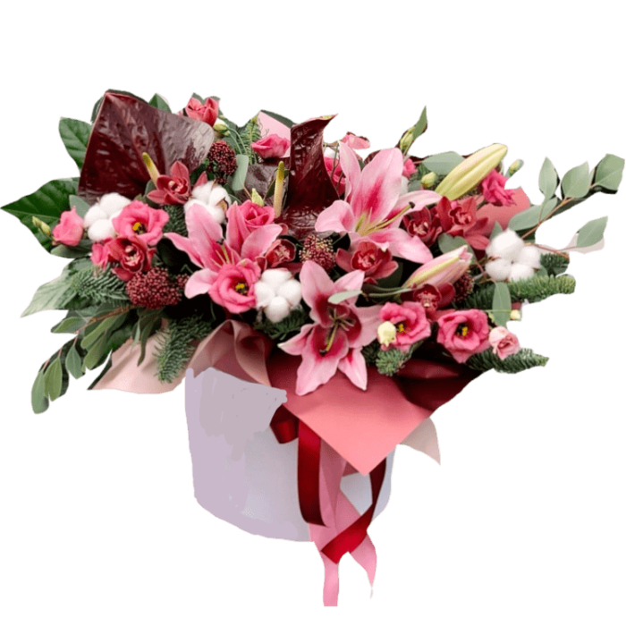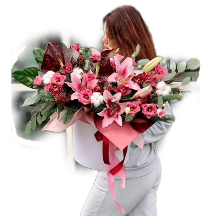 Склад: лілІЇ, антуріум, бавовна, еустома, скіммія, евкаліпт, картонний бокс. Склад композиції може бути незначно змінений в залежності від сезонності та наявності квітів. Але форма та кольорова гама залишиться незмінена.