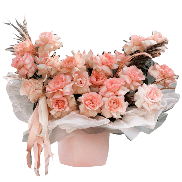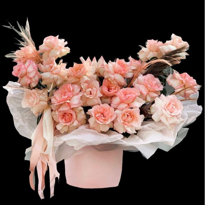 Склад: 21 персикова троянда, картонний бокс. Склад композиції може бути незначно змінений в залежності від сезонності та наявності квітів. Але форма та кольорова гама залишиться незмінена.