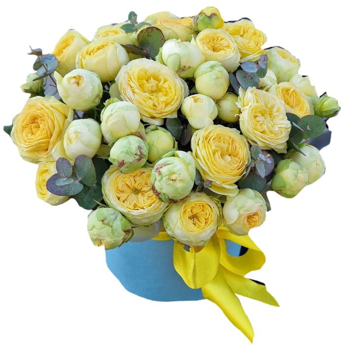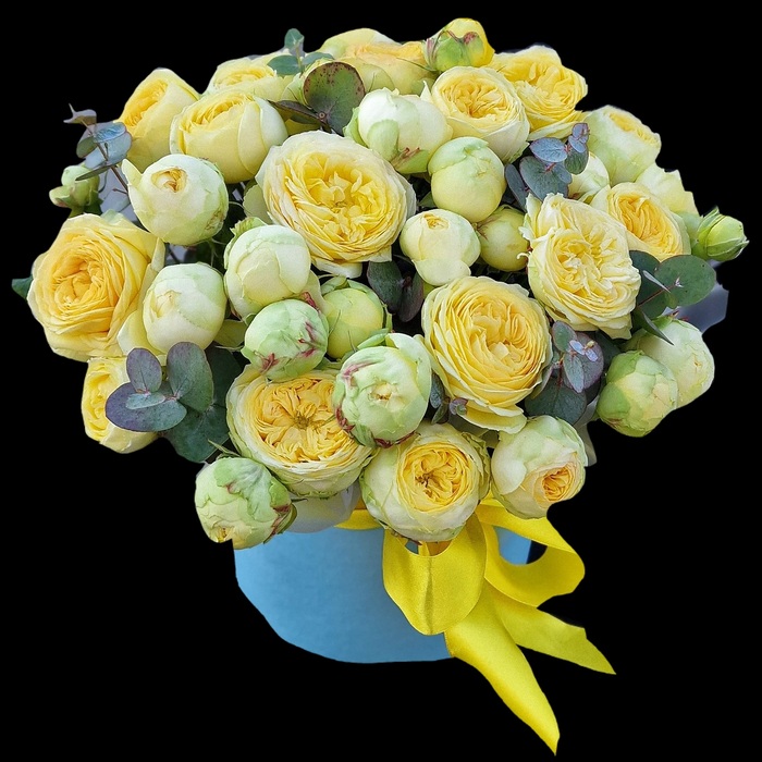 Склад: піоновидні троянди, евкаліпт, картонний бокс. Склад композиції може бути незначно змінений в залежності від сезонності та наявності квітів. Але форма та кольорова гама залишиться незмінена.