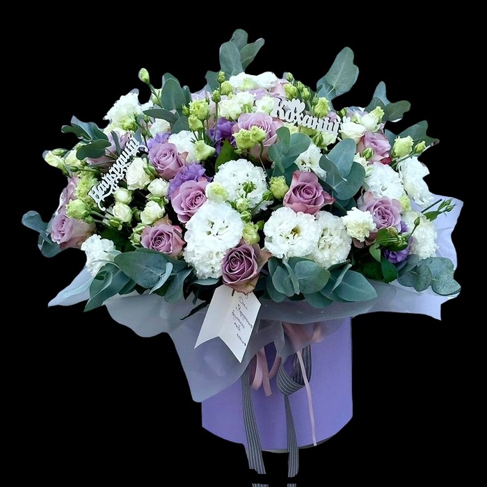 Склад: троянди Memory Lane, еустома, евкаліпт, картонний бокс. Склад композиції може бути незначно змінений в залежності від сезонності та наявності квітів. Але форма та кольорова гама залишиться незмінена.