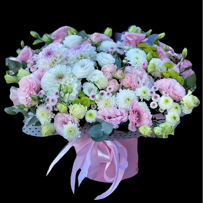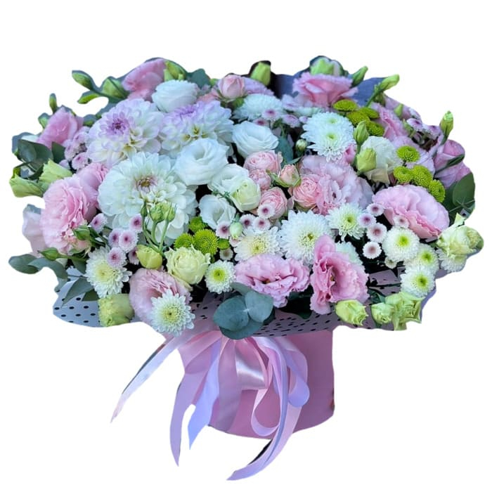 Склад: жоржини, кущова троянда, хризантеми, еустома, евкаліпт, картонний бокс. Склад композиції може бути незначно змінений в залежності від сезонності та наявності квітів. Але форма та кольорова гама залишиться незмінена.