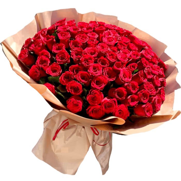 Состав: 101 красная роза, упаковочная бумага, лента.