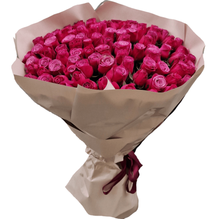Состав: 101 малиновая роза, упаковочная бумага, лента.