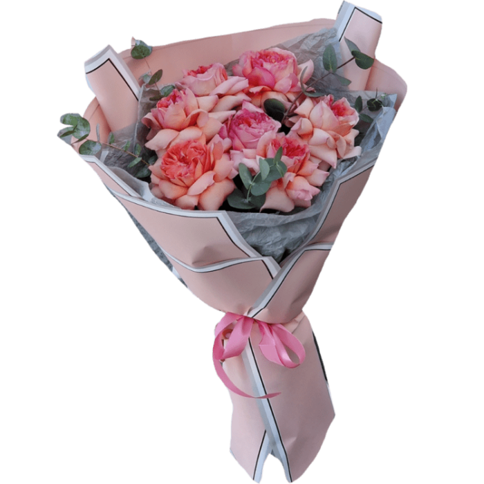 Букет из пионовидных роз 7 шт. с добавлением эвкалипта.