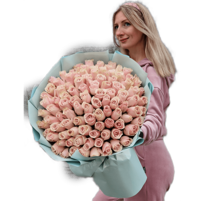 Состав: 101 нежно-розовая роза, упаковочная бумага, лента.