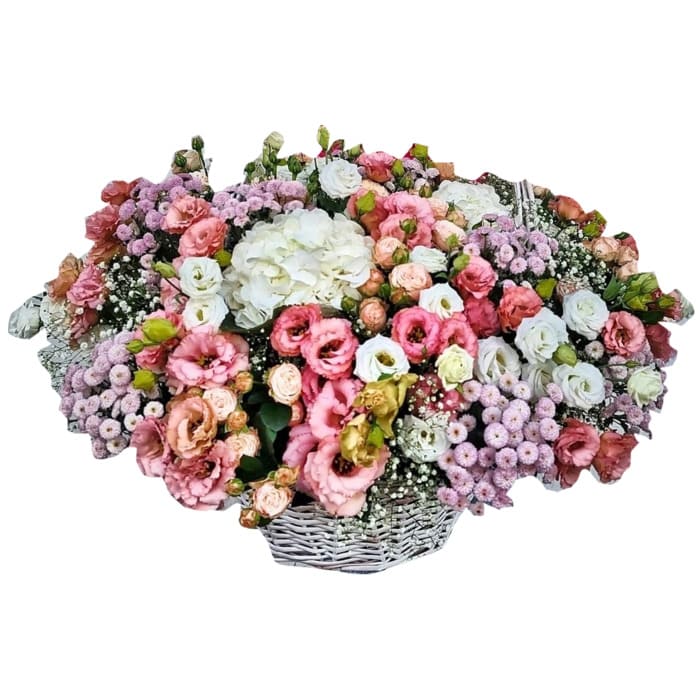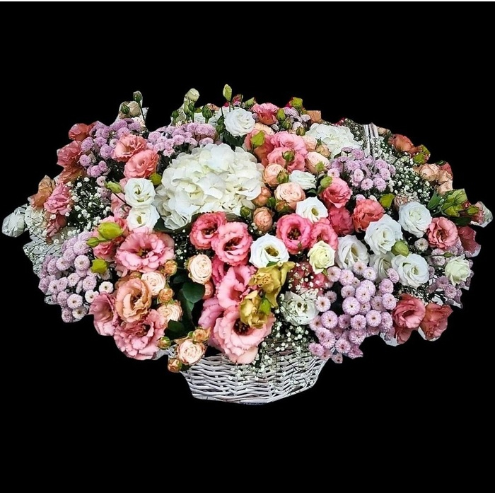Композиция из гортензии, хризантемы, эустомы и гипсофилы в корзине.