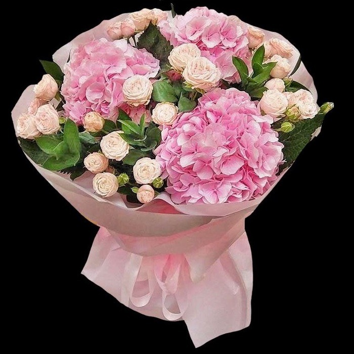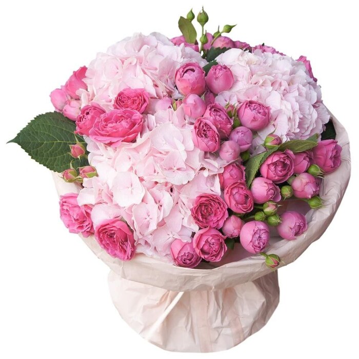 Букет из гортензий и роз Мисти Бабблз в розовых тонах.
