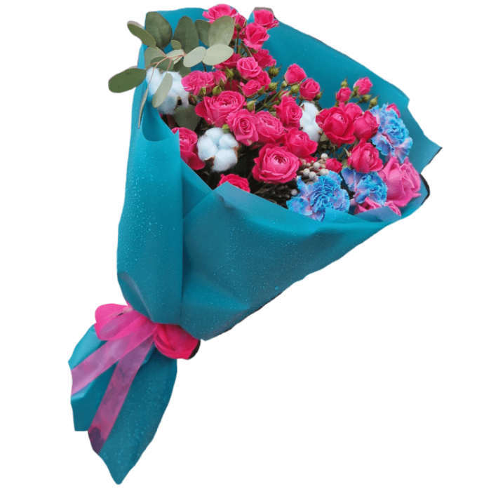 Букет из роз Леди Бомбастик, с добавлением классических роз, диантусов и хлопка.