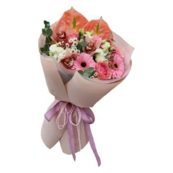 Состав: герберы, антуриумы, розы, эустома, хамелациум, упаковочная бумага, лента.