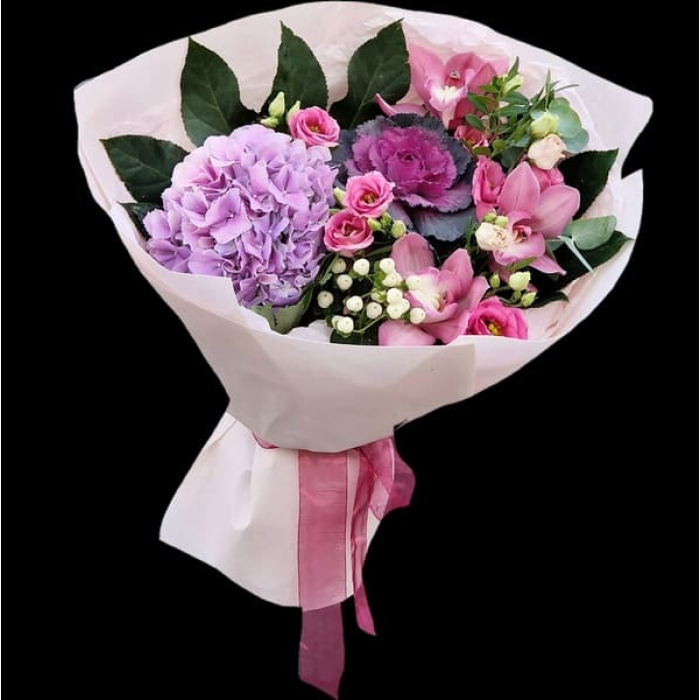 Букет с гортензией, орхидеями, эустомой, гиперикумом, декоративной капустой и зеленью.
