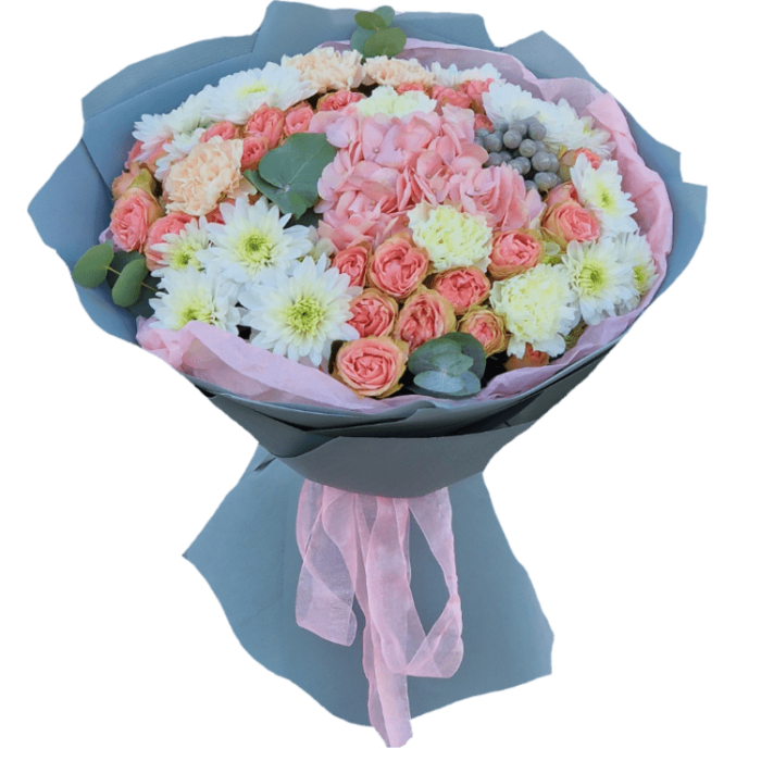 Букет с гортензией, хризантемами, диантусами и кустовыми розами, с добавлением эвкалипта.
