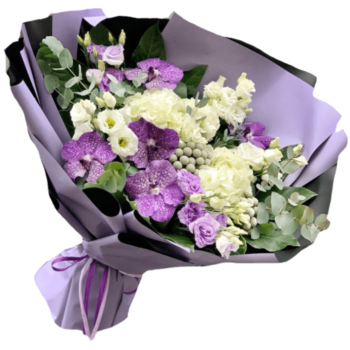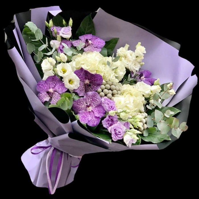 Букет с гортензиями, орхидеями, эустомой, брунией и эвкалиптом.