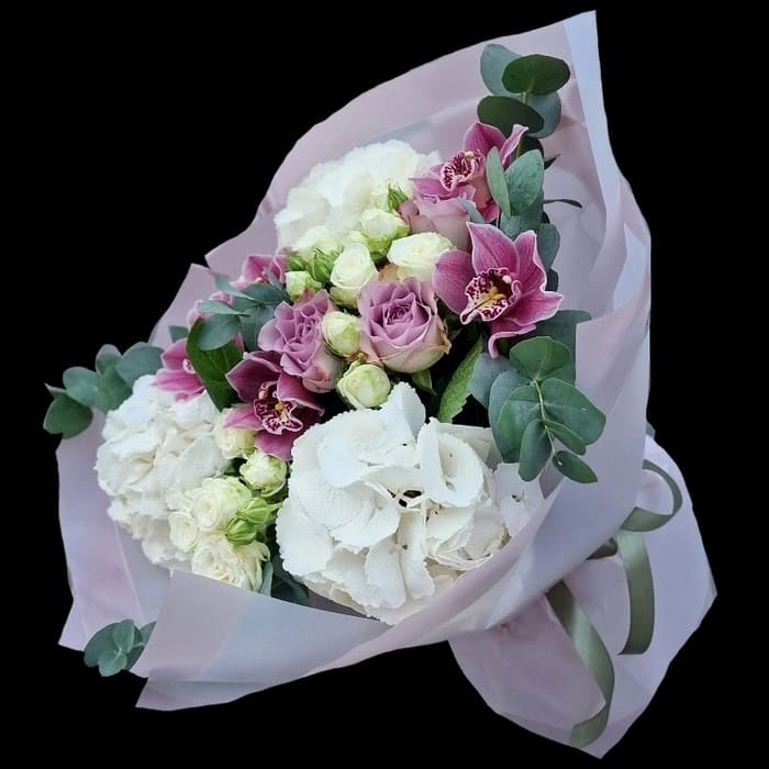 Букет с гортензиями, орхидеями, розами Memory Lane, кустовыми розами и эвкалиптом.Состав букета может быть незначительно изменен в зависимости от сезонности и цветов. Но форма и цветовая гамма остается неизменной.Перед о...
