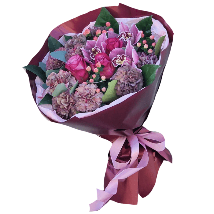 Букет с диантусами, розами, хиперикумом и орхидеями.Состав букета может быть незначительно изменен в зависимости от сезонности и цветов. Но форма и цветовая гамма остается неизменной.Перед отправкой присылаем фото/видео ...