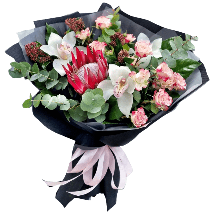 Букет с протеей, орхидеями, кустовой розой, скиммией и эвкалиптом.