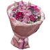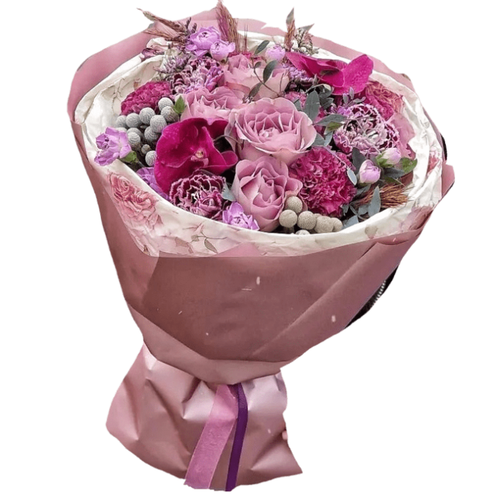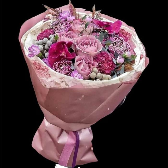 Букет с розами Memory Lane, диантусами, кустовыми диантусами, орхидеями, брунией и зеленью с добавлением сухоцветов.