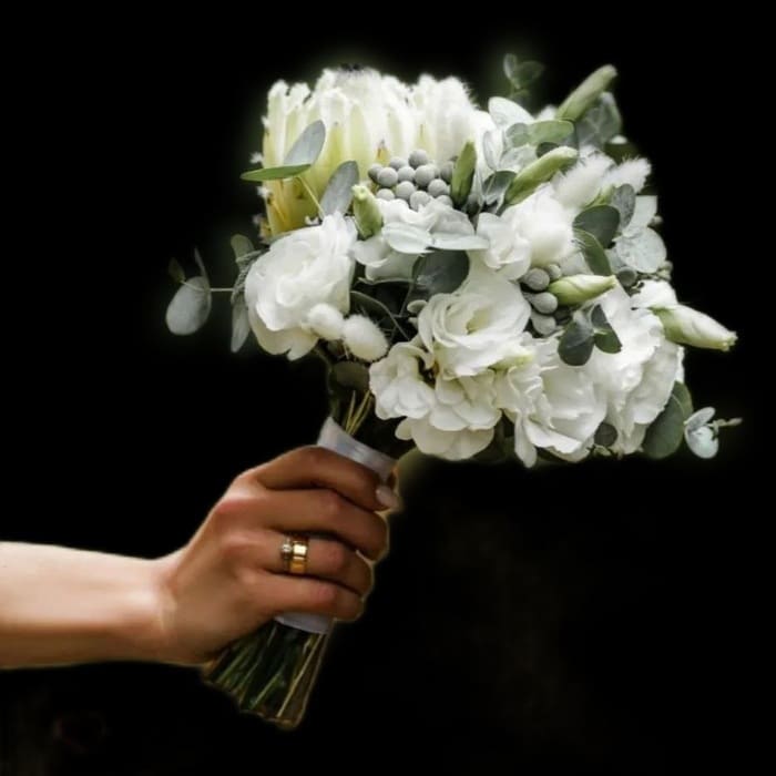 Букет невесты с белой протеей, эустомой, брунией и эвкалиптом.