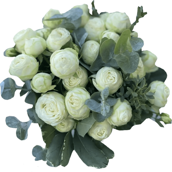 Свадебный букет из кустовой розы Сноу Волд с добавлением эвкалипта.
