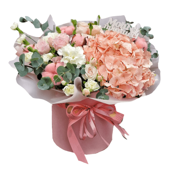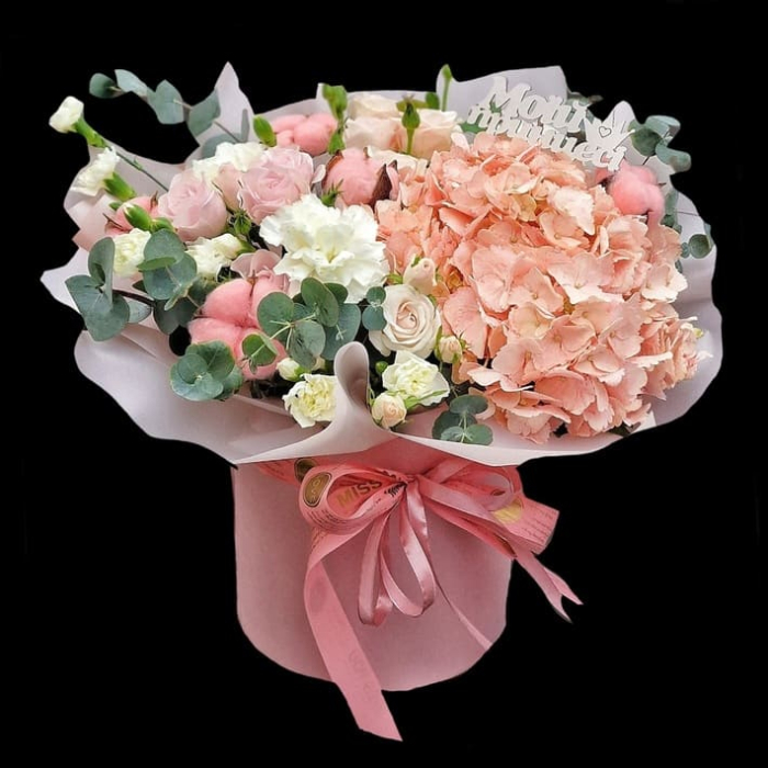 Состав: гортензия, розы, диантусы, хлопок, эвкалипт, картонный бокс, лента. Состав композиции может быть незначительно изменен в зависимости от сезонности и наличия цветов. Но форма и цветовая гамма остается неизменной.