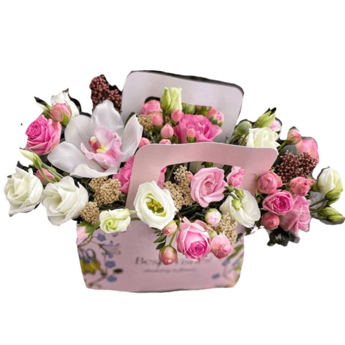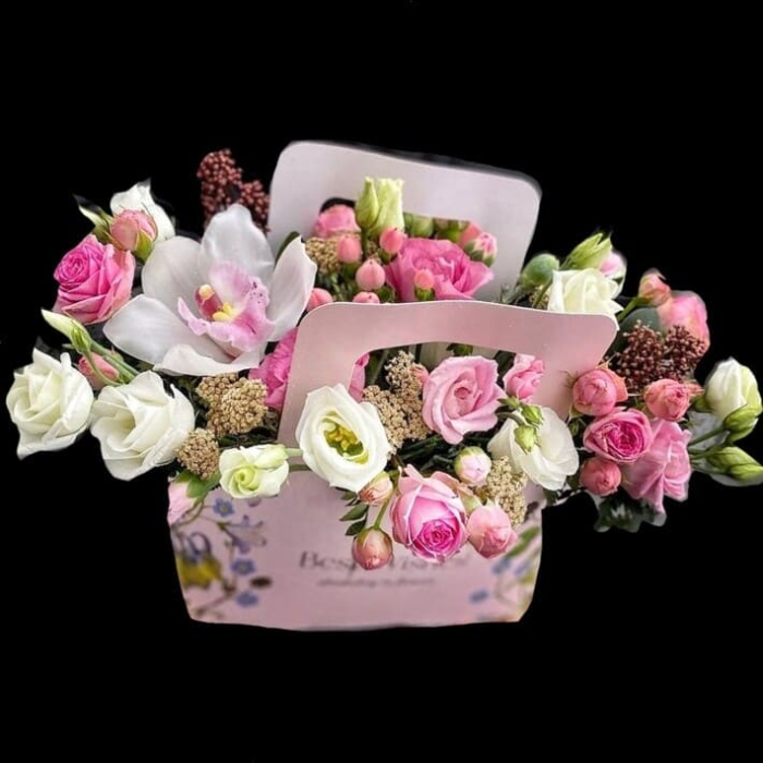 Состав: орхидея, кустовые розы, эустома, скиммия, картонный бокс. Состав композиции может быть незначительно изменен в зависимости от сезонности и наличия цветов. Но форма и цветовая гамма остается неизменной.