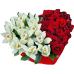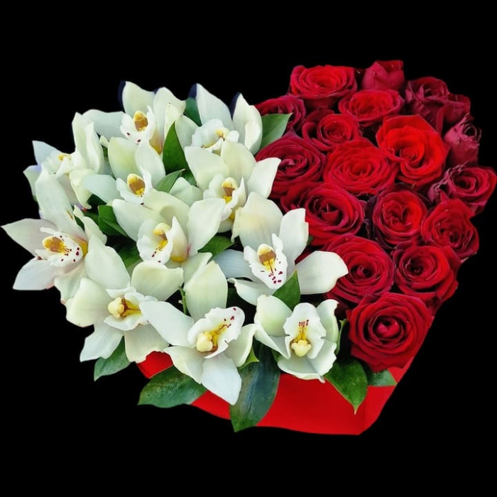 Состав: 17 красных роз, 11 орхидей, картонный бокс.