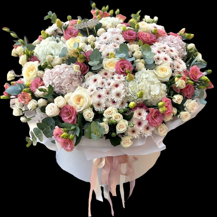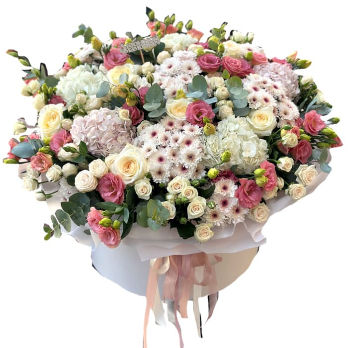 Состав: гортензии, розы, хризантемы, эустома, эвкалипт, картонный бокс, лента. Состав композиции может быть незначительно изменен в зависимости от сезонности и наличия цветов. Но форма и цветовая гамма остается неизменной.