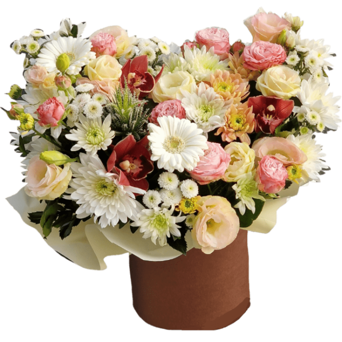 Состав: орхидеи, кустовая роза, герберы, эустома, хризантемы, бокс в форме сердца. Состав композиции может быть незначительно изменен в зависимости от сезонности и наличия цветов. Но форма и цветовая гамма остается неизменной.