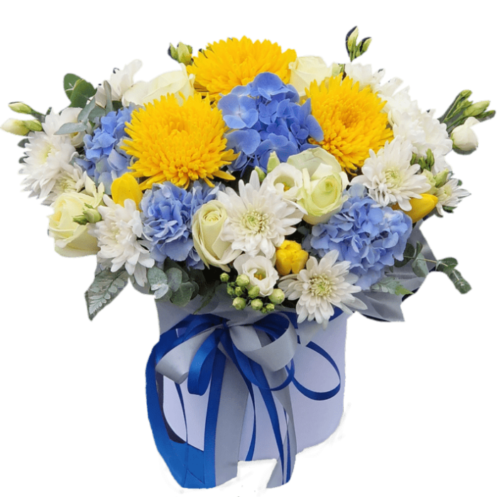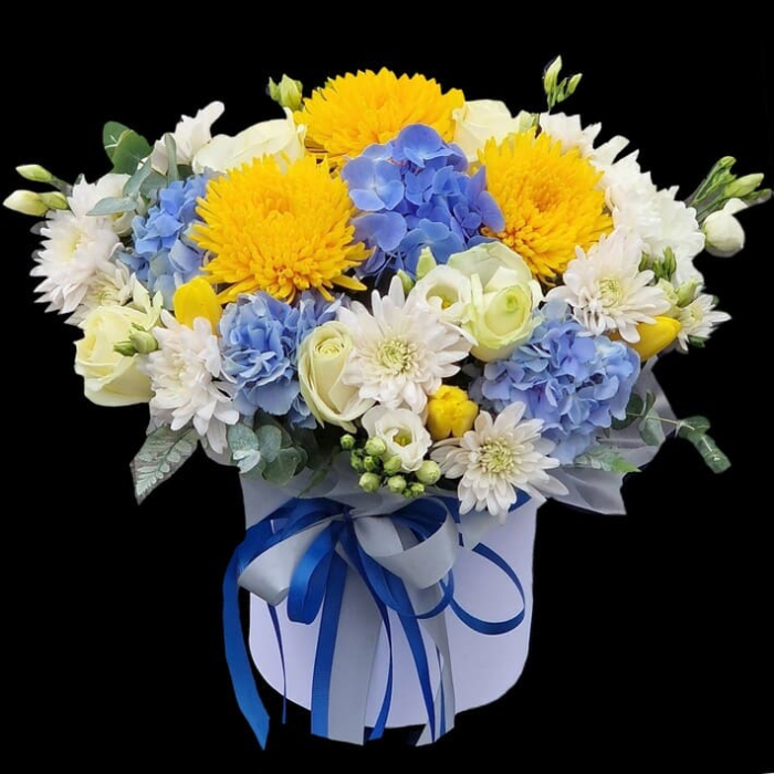 Состав: гортензия, хризантемы, розы, еустома, картонный бокс. Состав композиции может быть незначительно изменен в зависимости от сезонности и наличия цветов. Но форма и цветовая гамма остается неизменной.