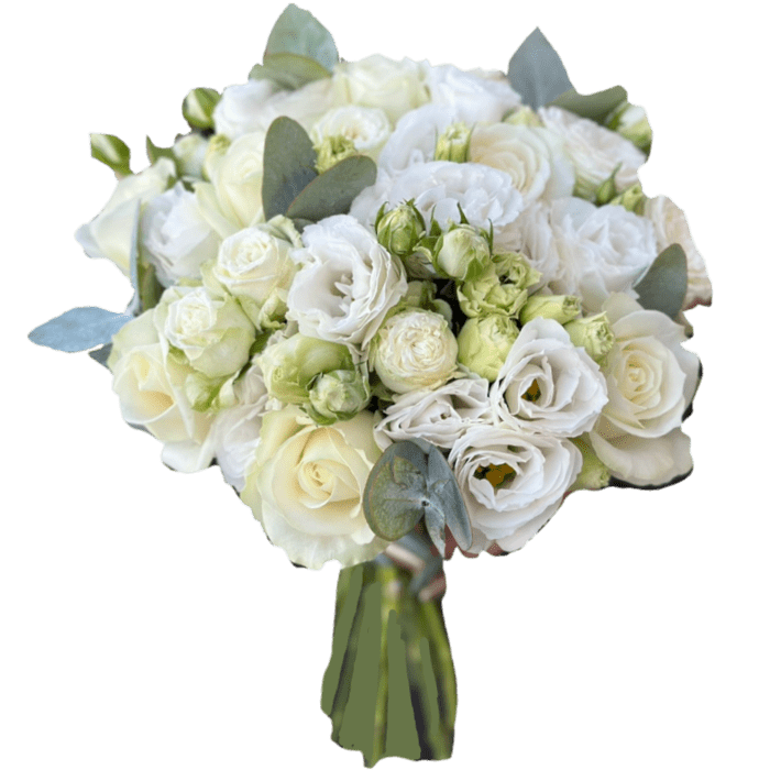 Букет нареченої з еустомою та кущовими трояндами у білих тонах.