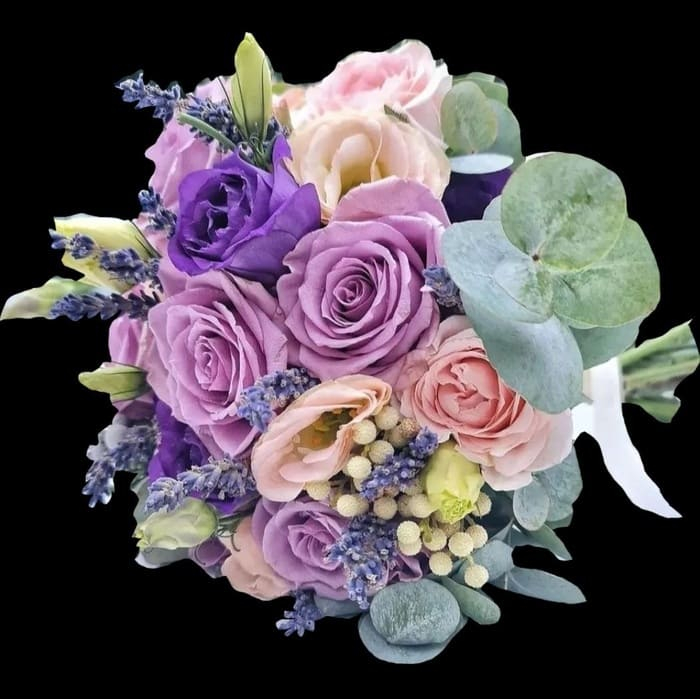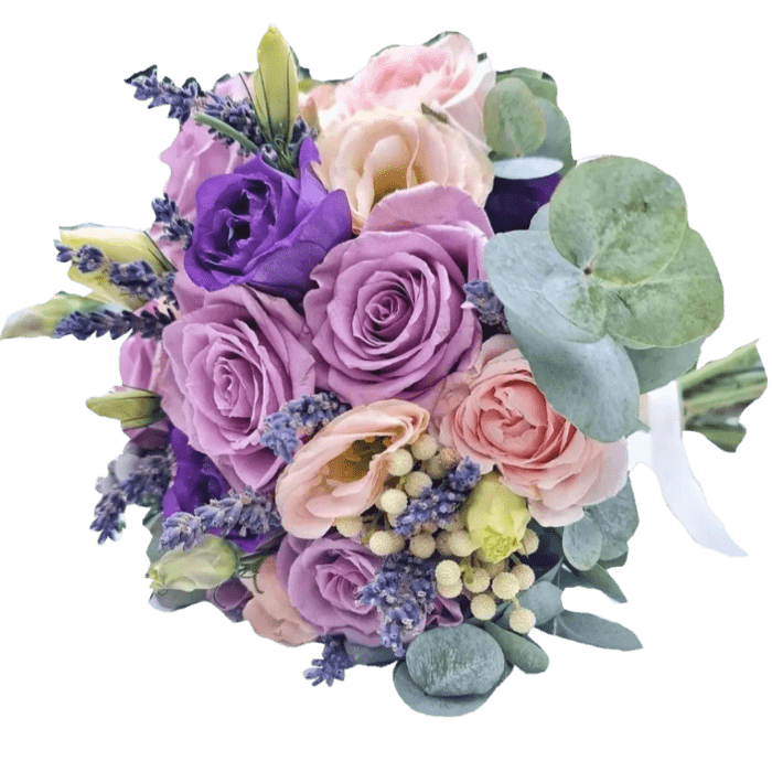 Весільний букет з трояндами, еустомою, брунією, евкаліптом та лавандою.