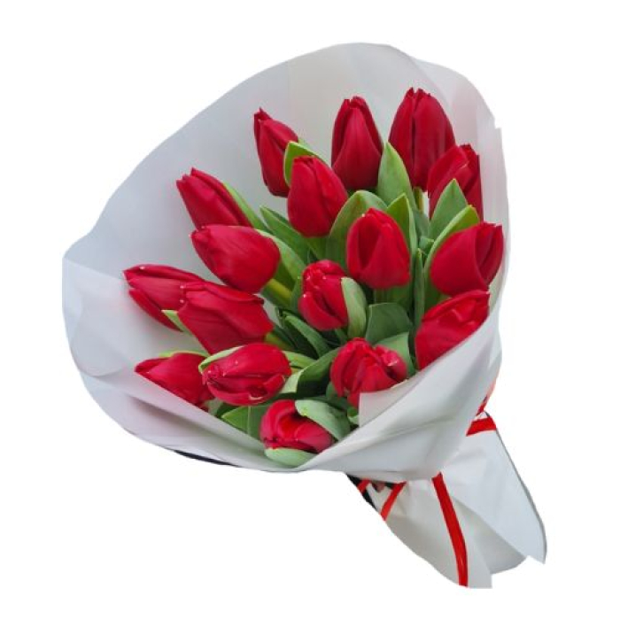 Склад: 17 червоних тюльпанів, пакувальний папір, стрічка.
