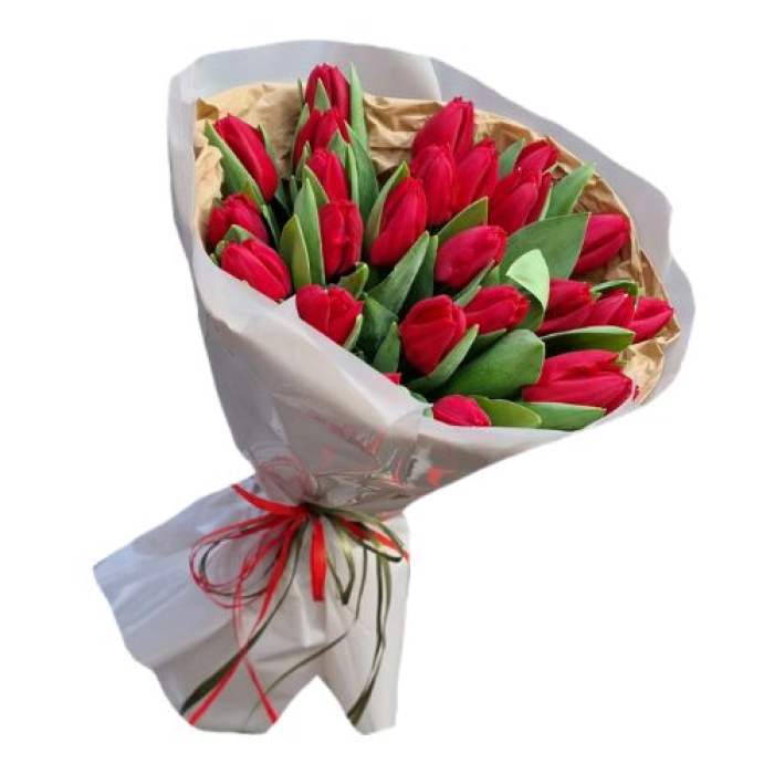 Склад: Букет 25 червоних тюльпанів, пакувальний папір, стрічка.