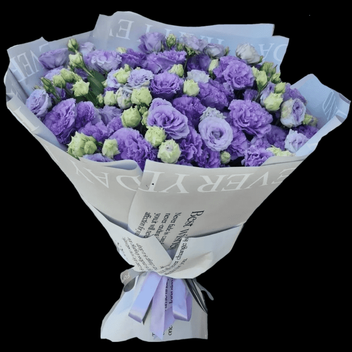 Склад: фіолетова еустома 15 шт., пакувальний папір, стрічка.
