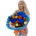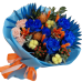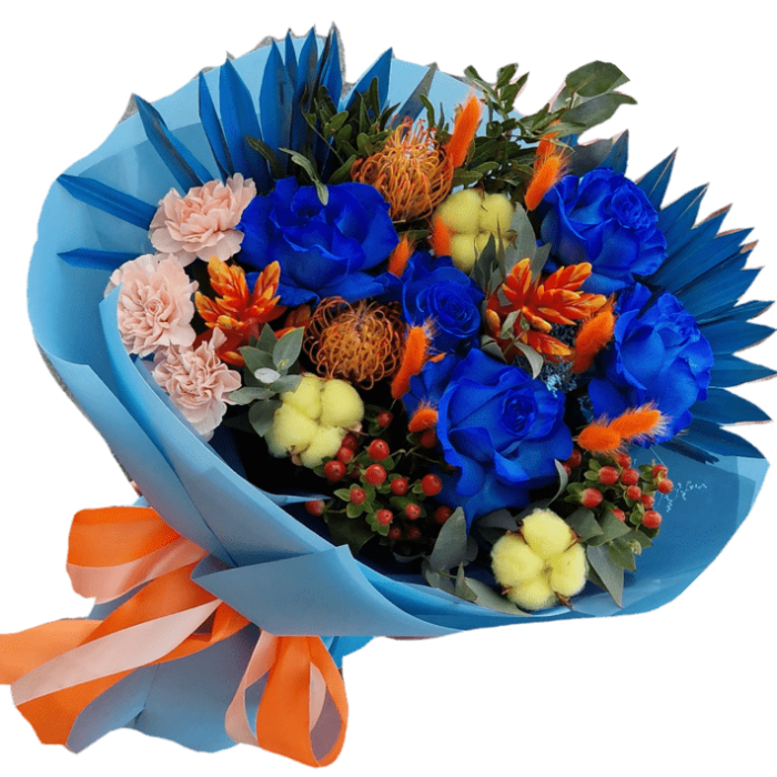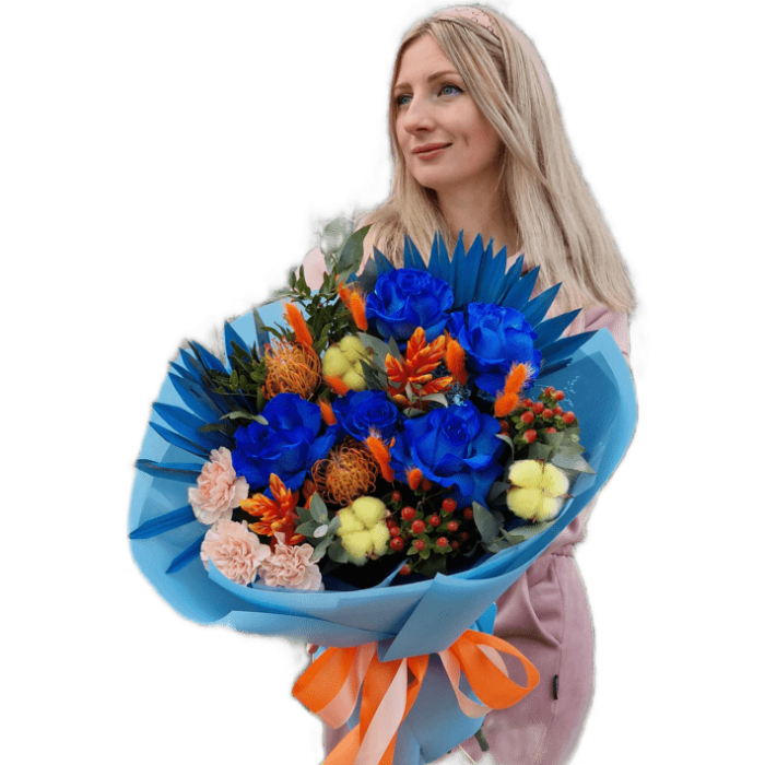 Склад: сині троянди, леукоспермум, діантуси, гіперікум, бавовна, зелень, пакувальна бумага, стрчка.