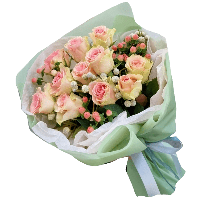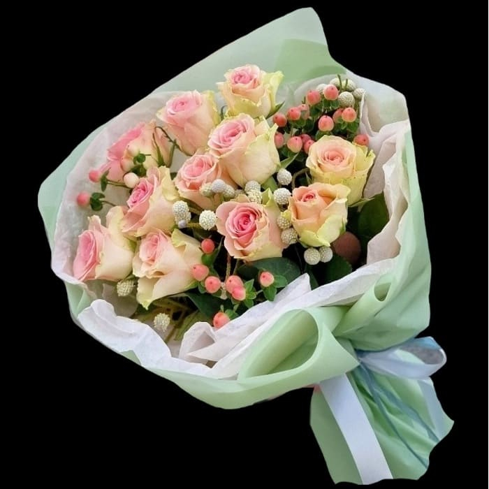 Букет з рожевих троянд 11 шт. з додаванням хіперікума та брунії.