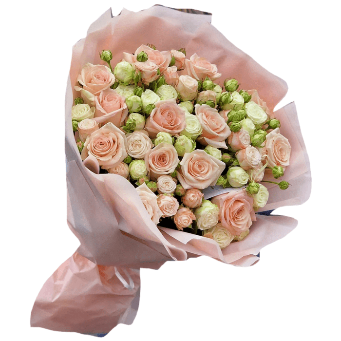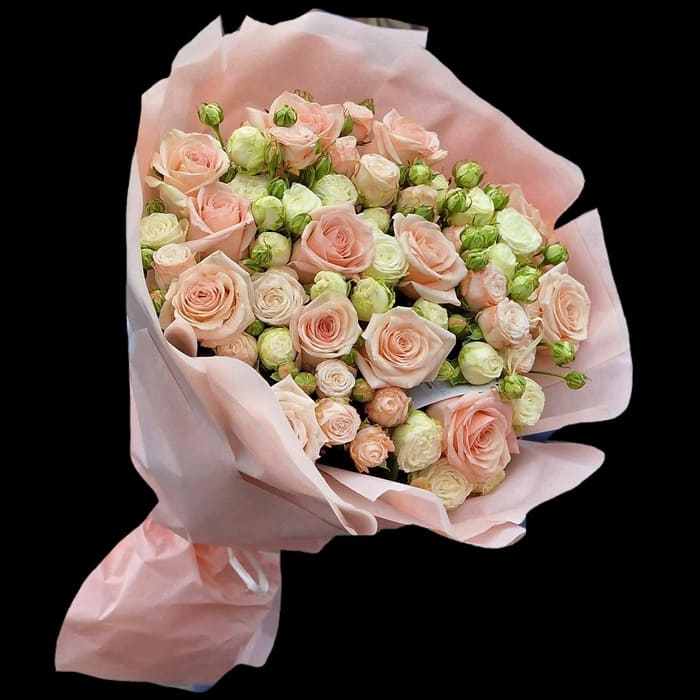 Букет з кущових та класичних троянд білого та ніжно-рожевого кольорів.Склад букету може бути незначно змінений в залежності від сезонності та наявності квітів. Але форма та кольорова гамма залишиться незмінена.Перед відп...