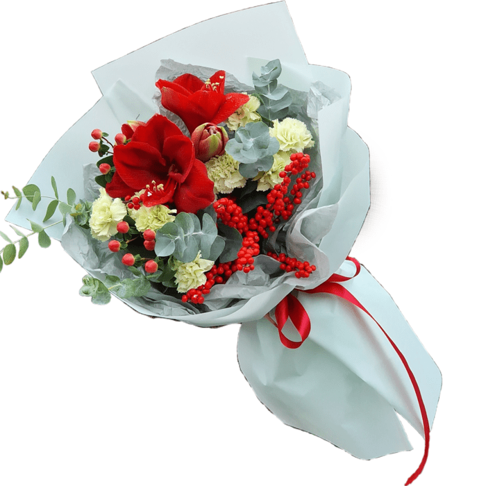 Склад: амариліс, діантуси, гіперікум, евкаліпт, ілекс, пакувальний папір, стрічка.