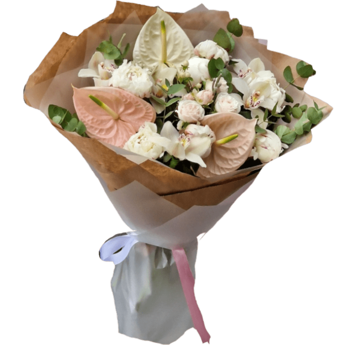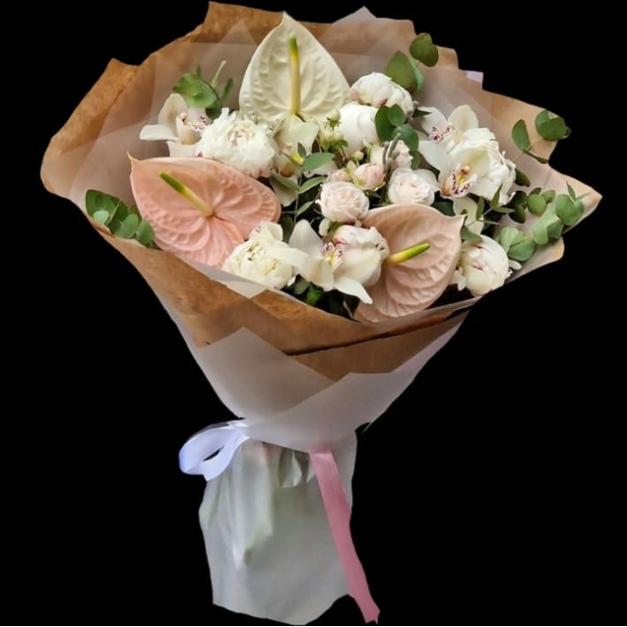 Букет з антуріумом, кущовими трояндами, орхідеями та евкаліптом.