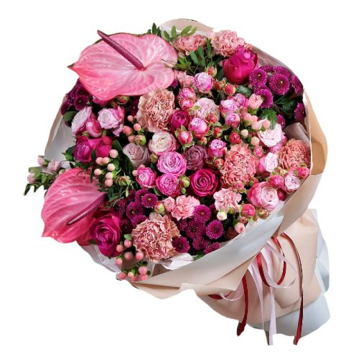Склад: антуріуми, класична та кущова троянда, діантуси, гіперікум, зелень, папір, стрічка.