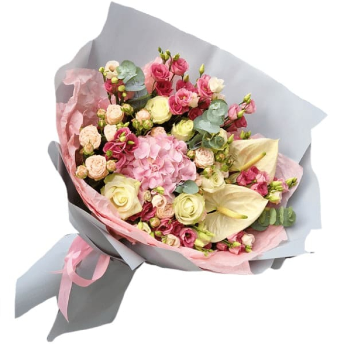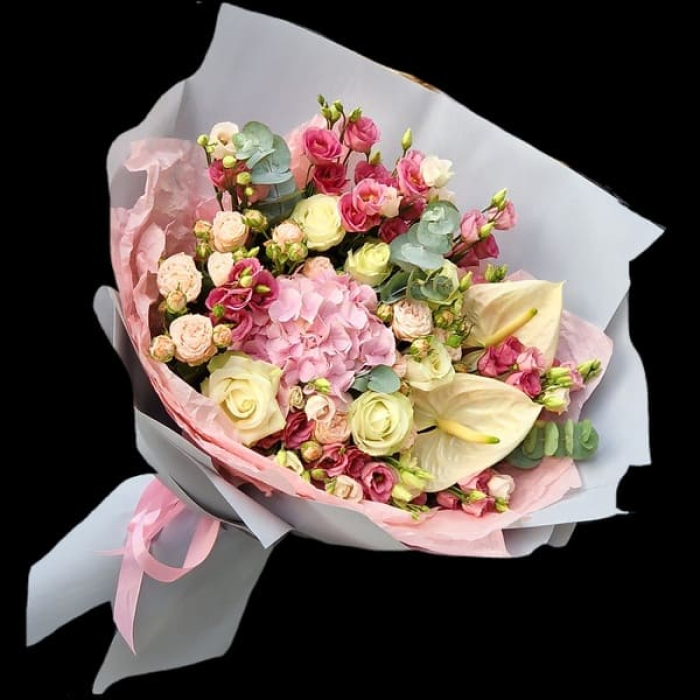 Букет з антуріумами, гортензією, трояндами, еустомою та евкаліптом.