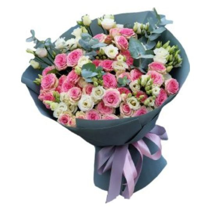 Опис Букет з еустомою та кущовою трояндою