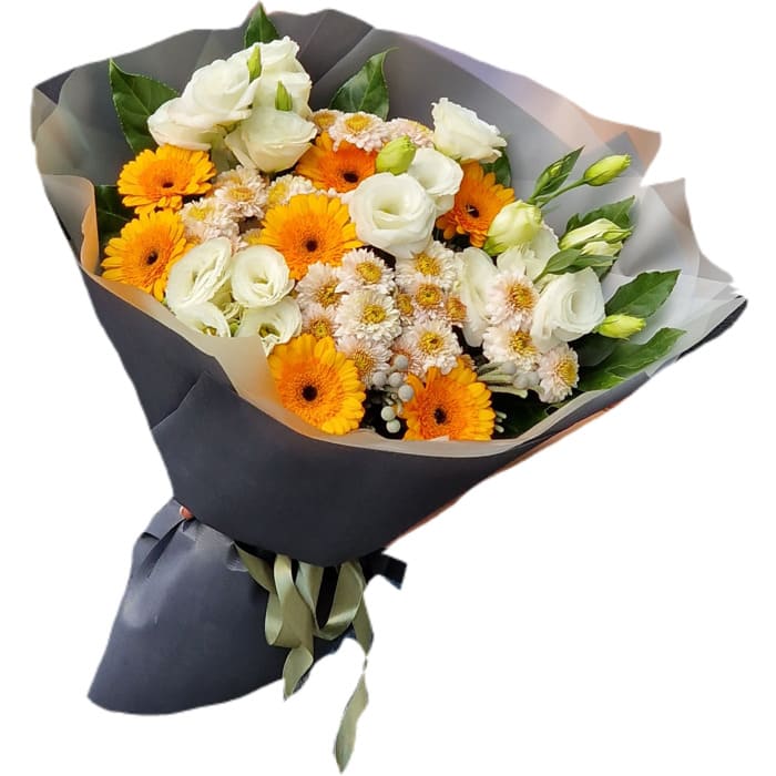 Букет з герберами, хризантемою, еустомою, гілочкою брунії та зеленню.