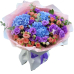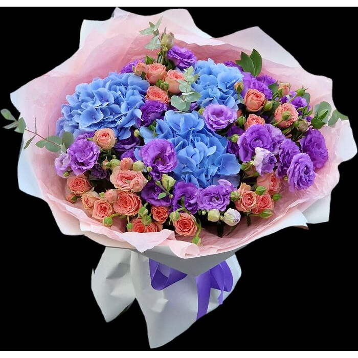 Букет з гортензіями, кущовою трояндою, еустомою та евкаліптом.